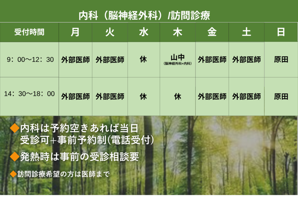 | 診療受付時間 (内科) | 月 | 火 | 水 | 木 | 金 | 土 | 日 |