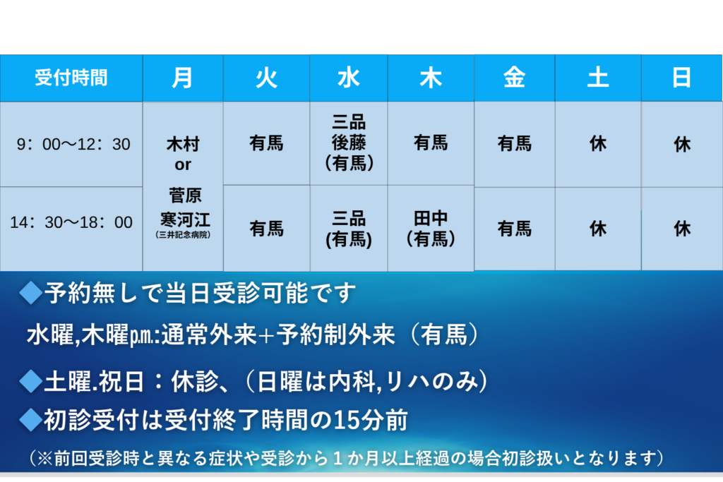 | 09:00 – 12:30 (初診最終受付12:15分迄) | ● | ● | ● | ● | ● | ー | ー |